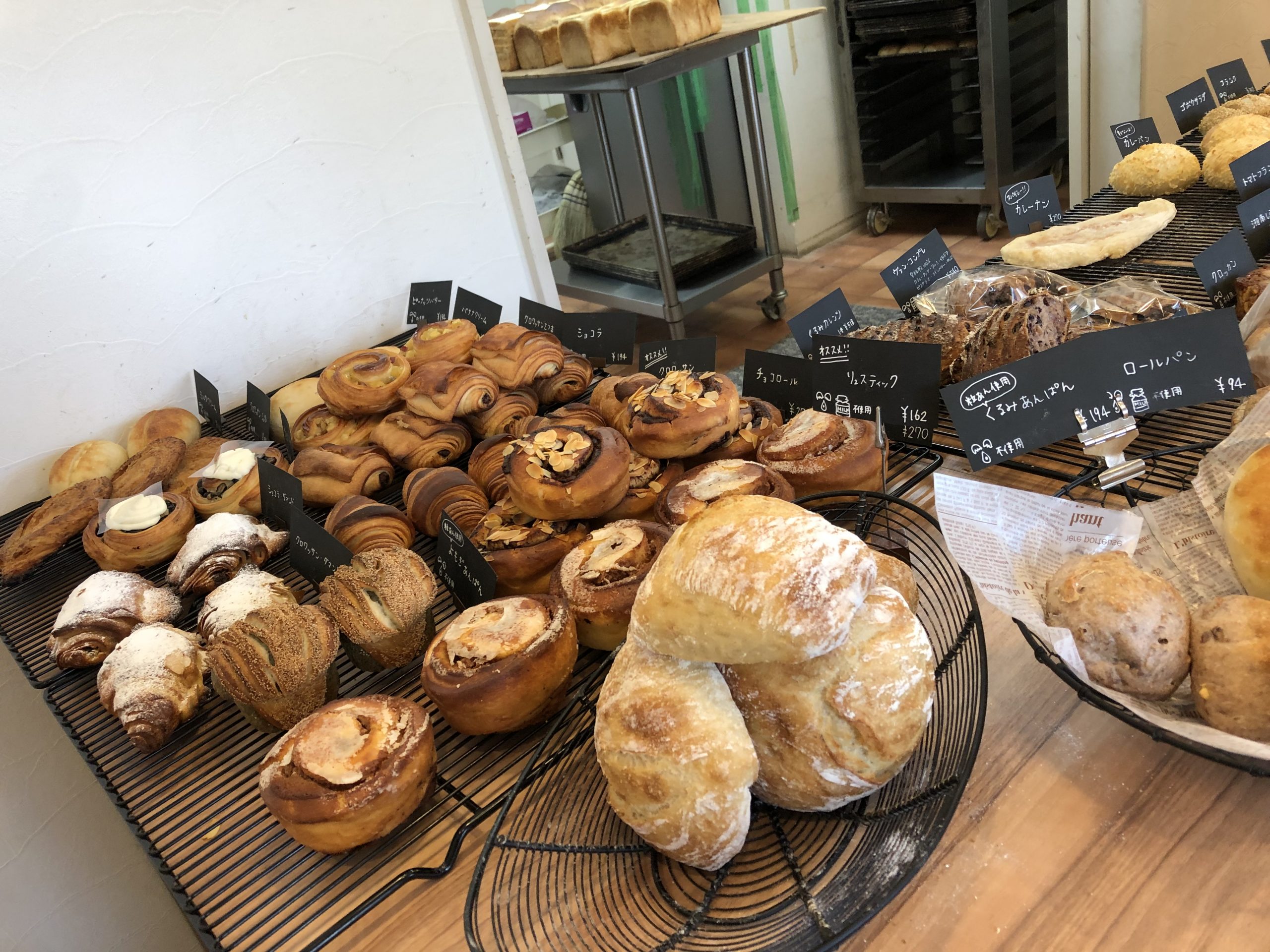 ミルククリーム、湘南シラスのフォカッチャ、くるみあんぱん、もちもちチーズ、大納言、そして6枚スライスのカルム。