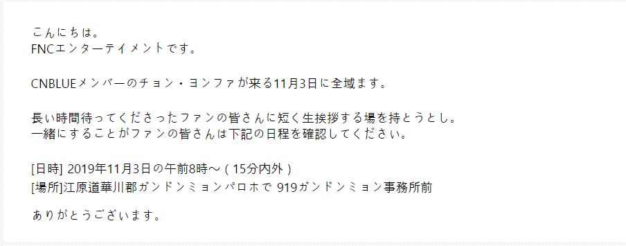 ヨンファが11月3日に除隊の挨拶をしてくれると、