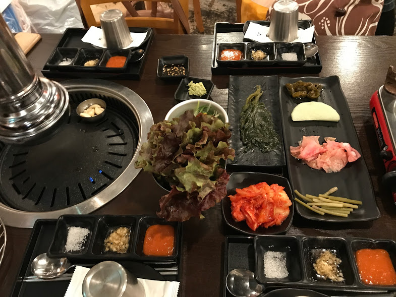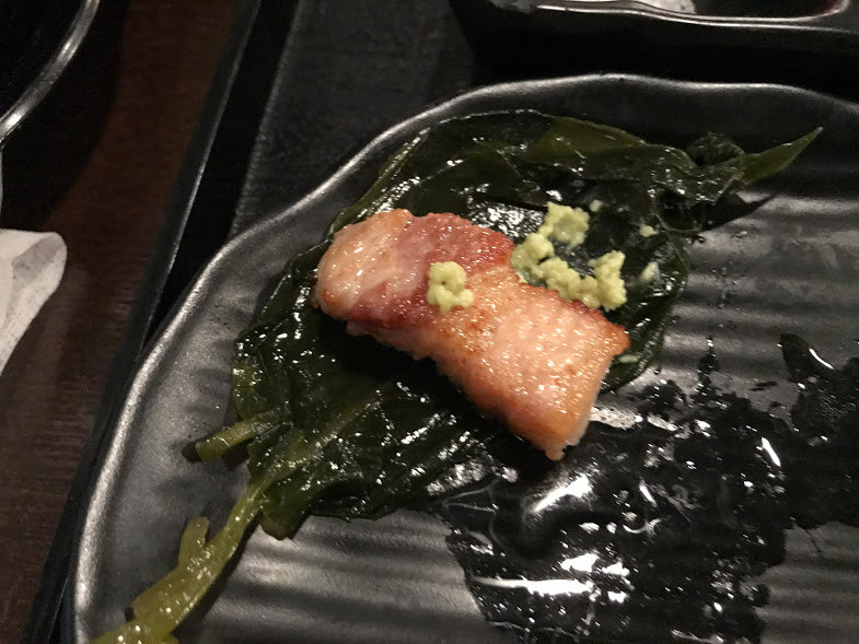 美味しそうに焼き上がったお肉をミョンイナムルに巻いてわさびとともに。