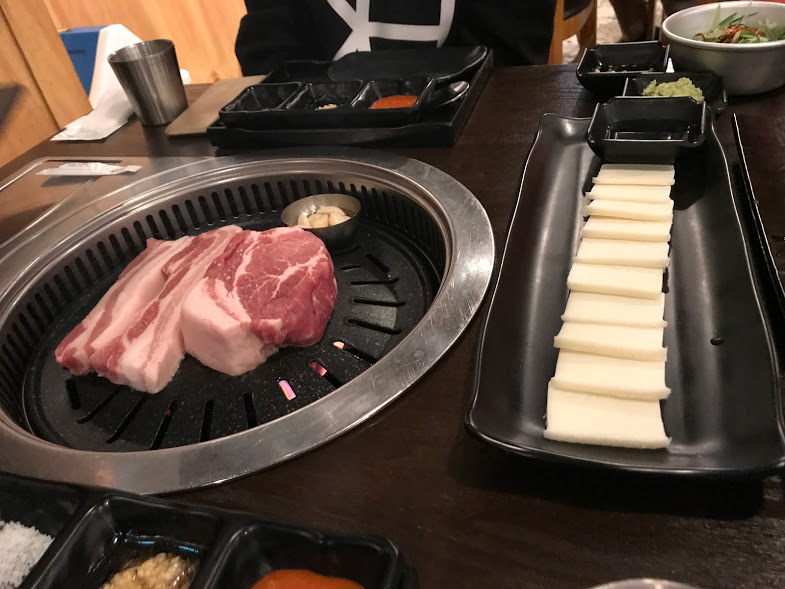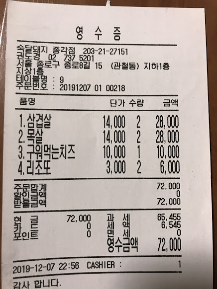 モクサル14,000ウォン(約1,289円)とサムギョプサル14,000ウォン(約1,289円)を