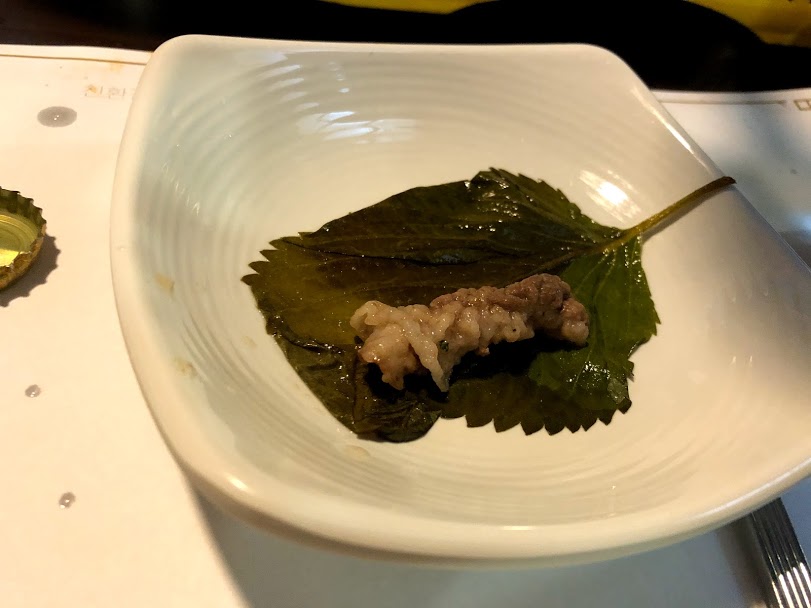 エゴマの葉の醤油漬けにお肉とアワビと平貝を包んでいただきました。
