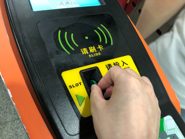 改札通るときはSuicaのようにタッチパネルにコインをタッチして、降車駅ではコインは回収されます。