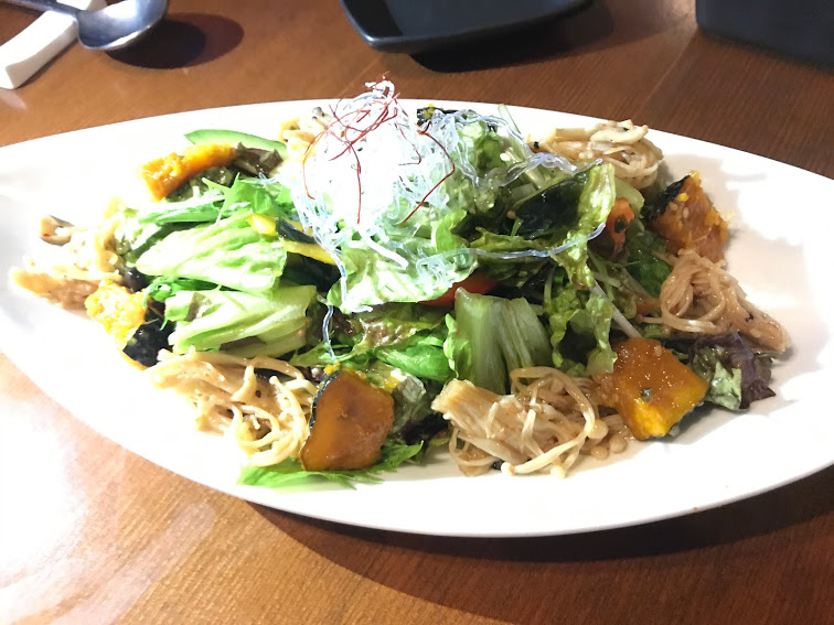 サニーレタス以外にもかぼちゃやエノキで具沢山のチョレギサラダ。
