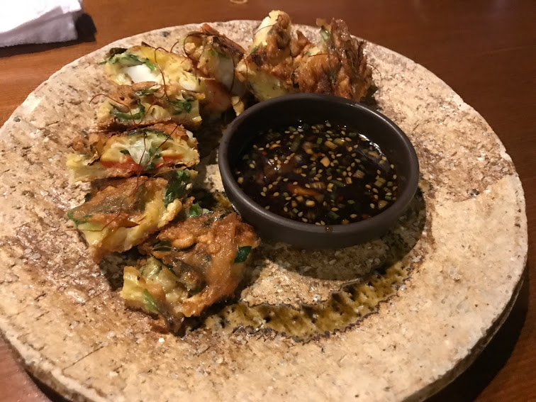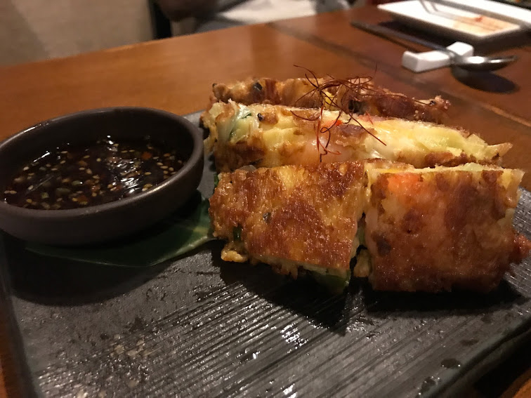 ぷりぷりの海老がたくさん入って、こんがり焼かれたチヂミ。