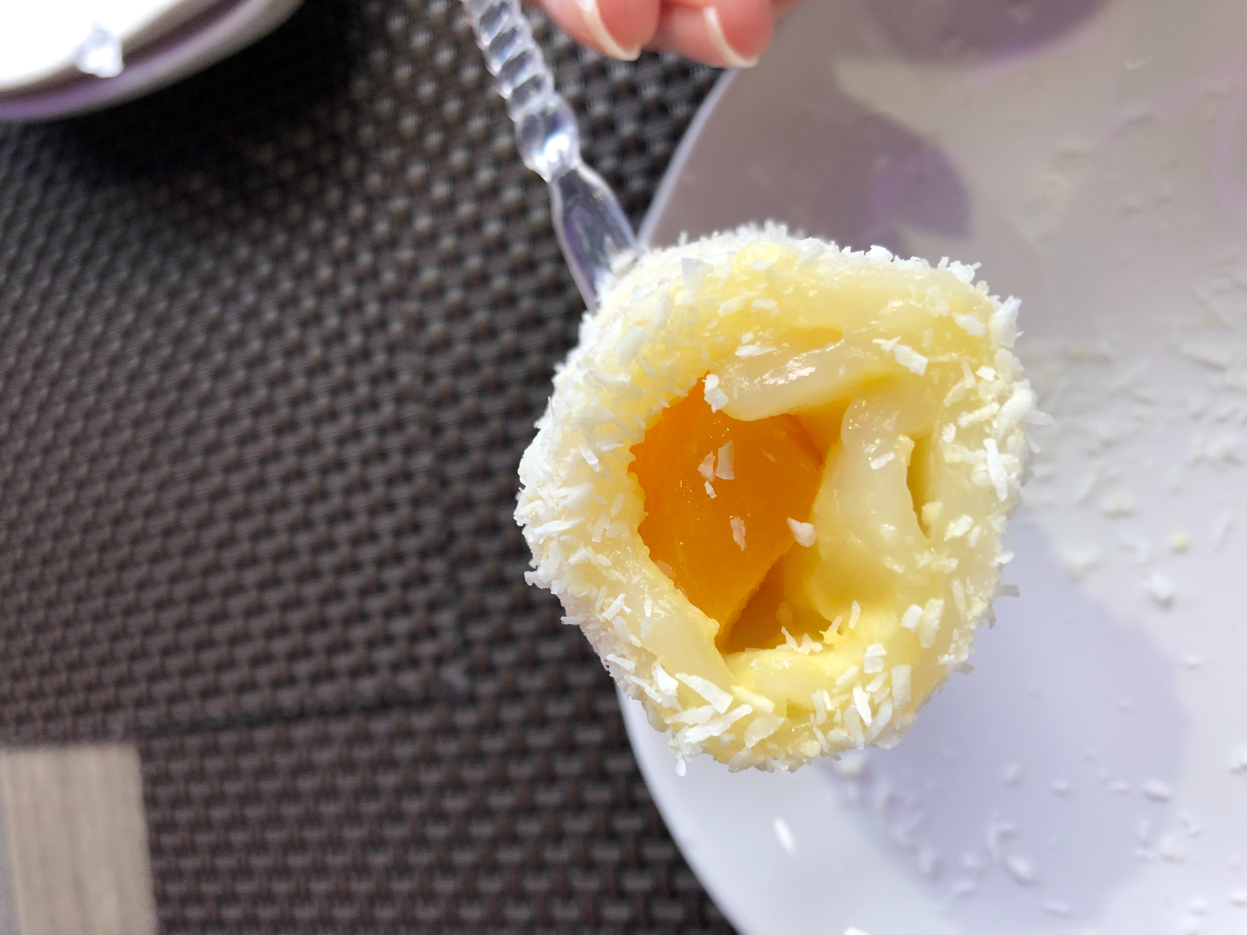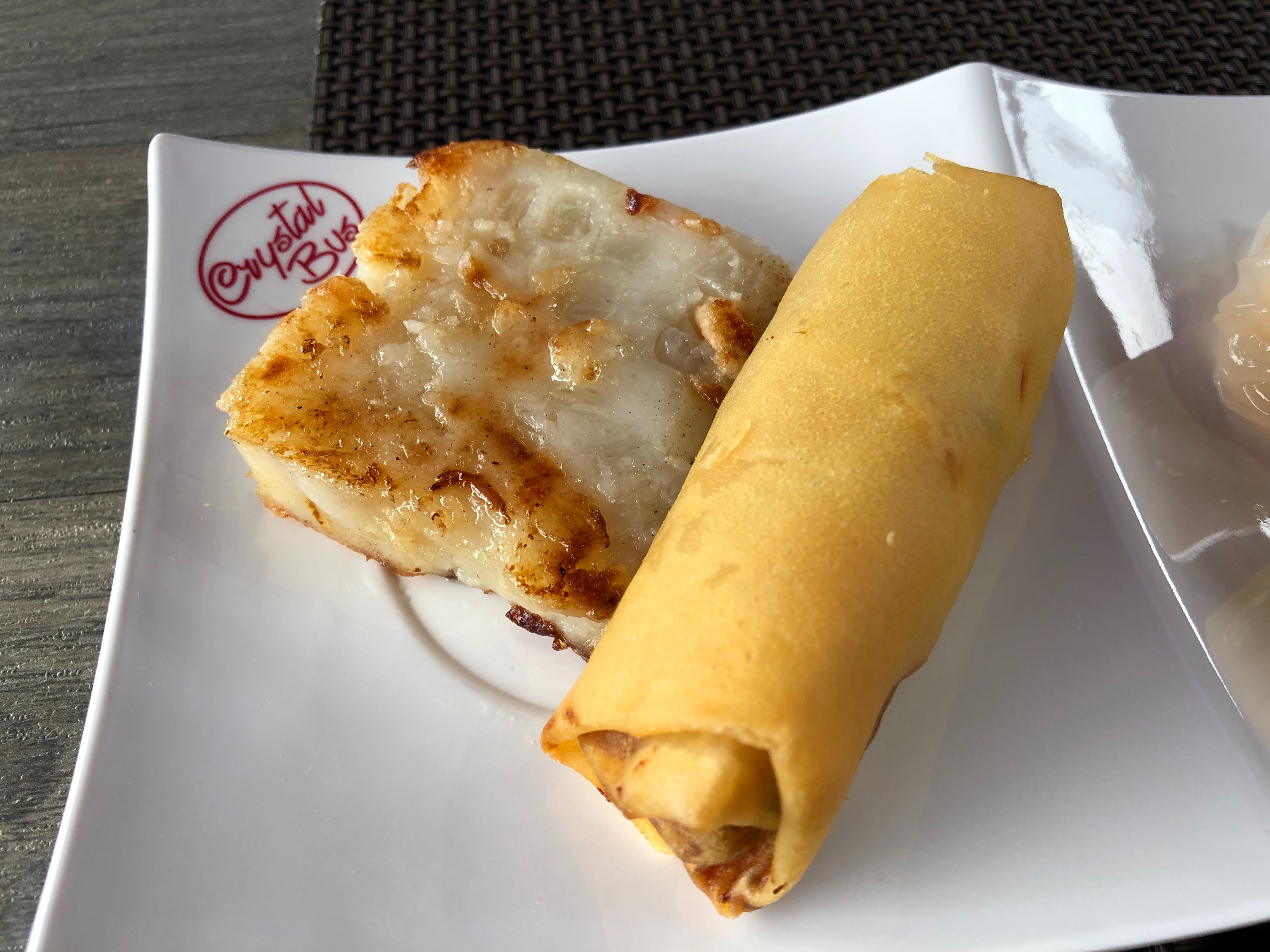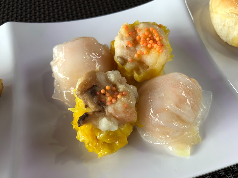 ・点心セット内容:1. エビ餃子とシュウマイ 2. 大根餅(蘿蔔糕)・春巻・ちまき(珍珠雞)3. チャーシュー饅頭(叉燒餐包)4. デザート・マンゴーカスタードロール(奶皇卷)5. ドリンク1杯