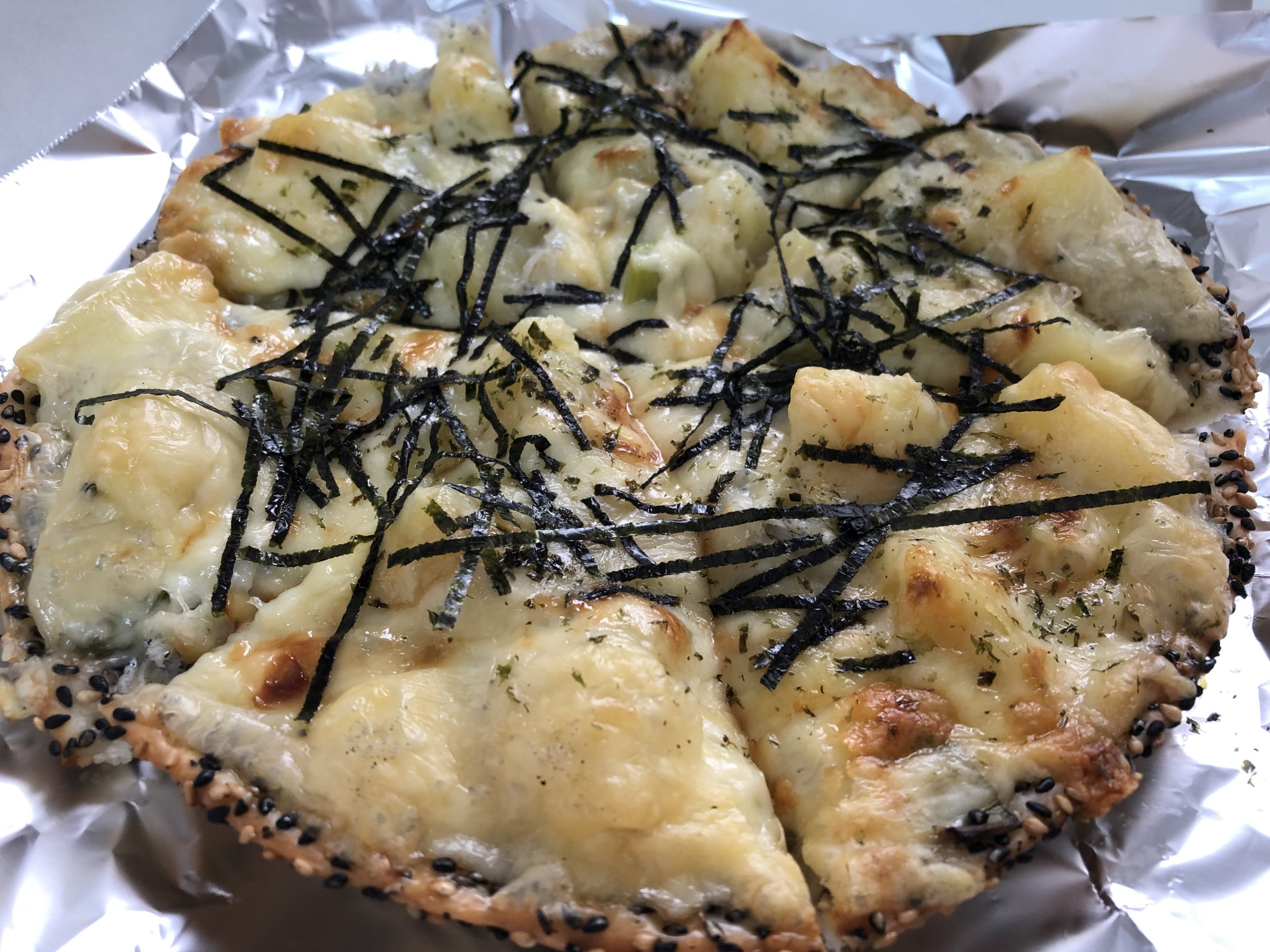 生地がごま入りでシラスやじゃがいもがトッピングされた、和風ピザ。