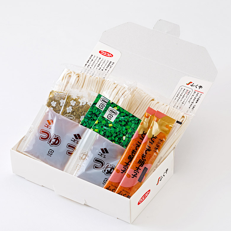 ウエストこだわりの半なま麺にふくやの油漬け明太子「味な油漬け どこでも明太子」を組み合わせ、つゆは九州の甘口醤油のだしが付いています。