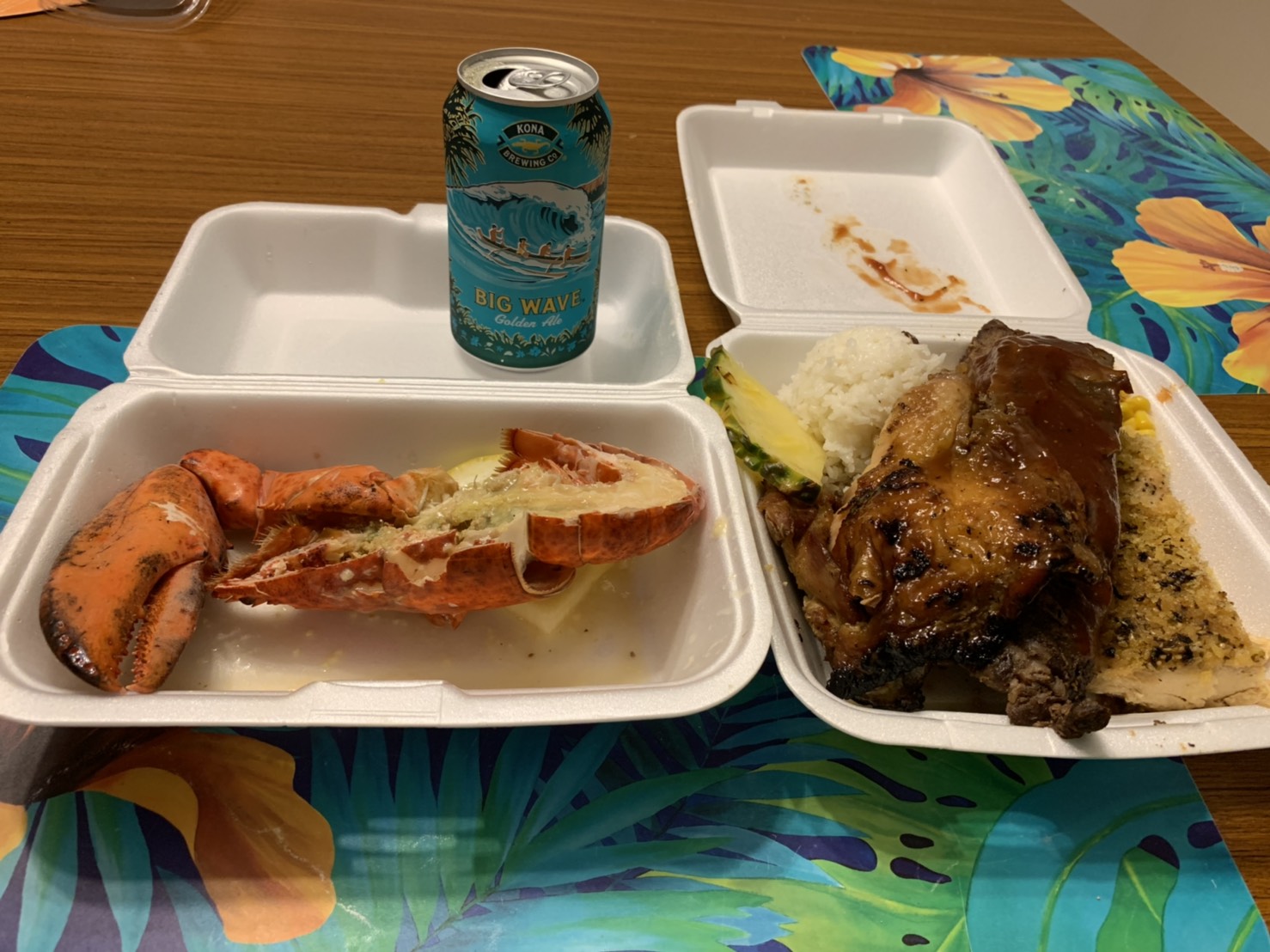 ロブスター、マヒマヒチキン、スペアーリブ、豪華なプレート。